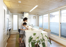 私たちの想いをすべて注ぎ込んだ、省エネルギー住宅のフラッグシップ(最上級)として位置づけた住まい。スーパーウォール工法、輻射冷暖房システム、太陽光発電システムを採用していますが、ハードの性能を徹底的に向上して終わりではなく、「室内微気候」と呼ぶ空気の流れを考慮した設計上の工夫も見どころの一つです。