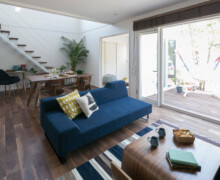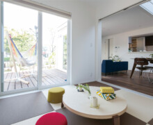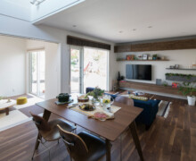 リビング部分はダイニングやキッチンから1段低く設定されて、マテリアルのみで分けるよりも強く意識的に空間が分けられている。